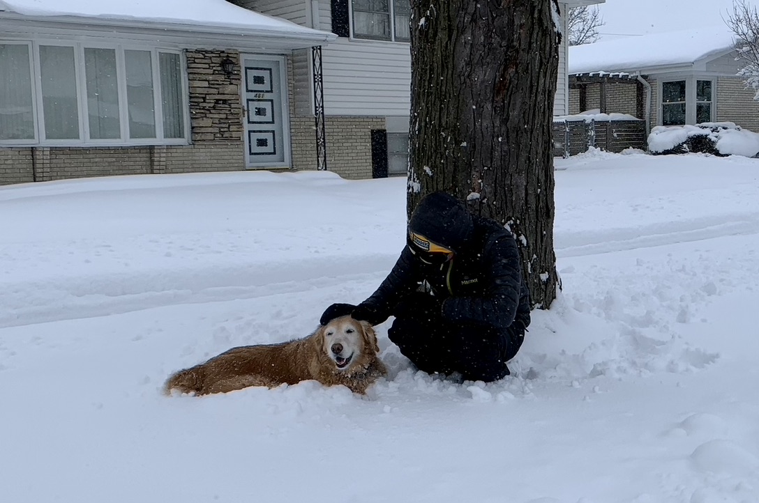 Eventually she slows and catches her breath, wet snow caking her fur. Drew decides to test out his new snow pants and huddles next to her. He gently strokes her as that ever-present smile seems to get wider. That’s delight. To do. And to witness.