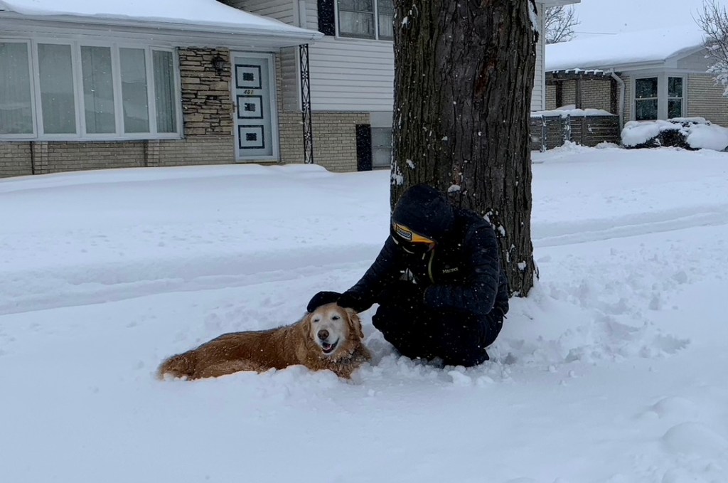 Once outside, she looks around and sniffs. Golden retrievers have a keen sense of smell, and Merrows is fond of trying to detect whatever fragrance might be in the wind. Possums, skunks, other dogs…it doesn’t matter. And with snowflakes melting on her warm nose, she occasionally snorts. It probably tickles.