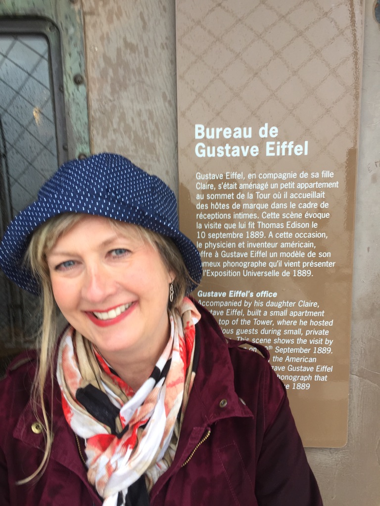 There she is, next to a brief description of Gustave Eiffel’s office way up there written in both French and English. In her rain-spattered coat. In that darling blue polka dot hat. With a rogue tendril of her blonde locks tumbling aside her most beautiful smile.