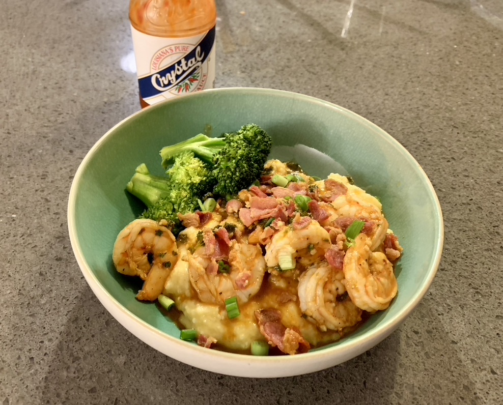 I nudged the computer mouse on the desk to wake up our computer, then entered ‘shrimp bacon recipe’ into Google. Although I have a small bookcase full of cookbooks from which to reference, I am still a neophyte when it comes to consistently pulling tasty ideas out of them. So as I scrolled down the returns, I somehow added ‘cheesy grits’ to the search. Don’t know how I thought of it. Probably from watching too many episodes of ‘Diners, Drive-Ins and Dives’ on the Food Network.